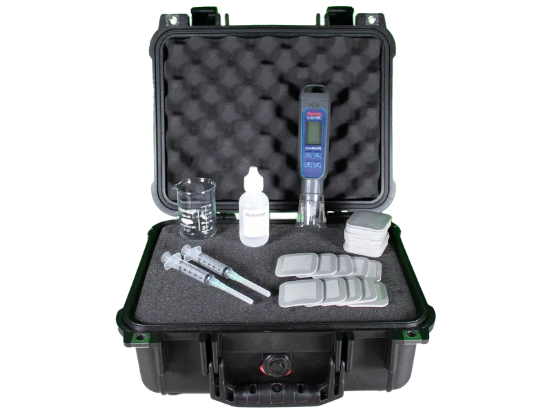 KTA Kits are used to extract surface samples and analyze the samples for chlorides and other soluble salts. The KTA Bresle Kit-3 conforms to ISO 8502-9, and contains all of the equipment required to perform testing in the field. The KTA Bresle Kit 3 contains a pack of 25 Bresle Patches (latex cells), two โ 3cc syringes w/ needles, and a Hanna TDS/EC conductivity meter. All equipment is contained in a handy plastic carrying case.