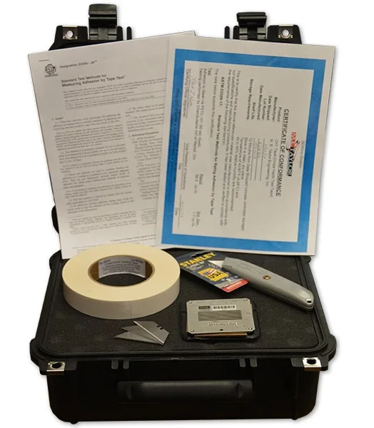 The KTA Cross Cut Guide Adhesion Test Kit contains all of the equipment you need to perform cross-cut adhesion testing according to Method B in ASTM D3359. A precision machined stainless steel guide/template contains 11 precut slots for maintaining 2mm spacing between incisions (for coatings between 2 and 5 mils thick), and contains adjustable, pointed set screws for leveling the guide on uneven surfaces while keeping it in place. The Guide is packaged in a protective vinyl pouch with an Allen wrench to adjust the leveling feet. The kit comes complete with a Guide, utility knife and replacement blades, a roll of tape, all in a LIFETIME Warranty Pelican 1400 carrying case.