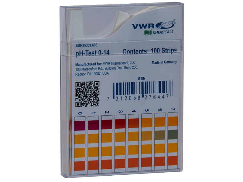Pack of 100 Colorfast strips for measuring the pH of surfaces or solutions. Four-color match system enables more precise measurements